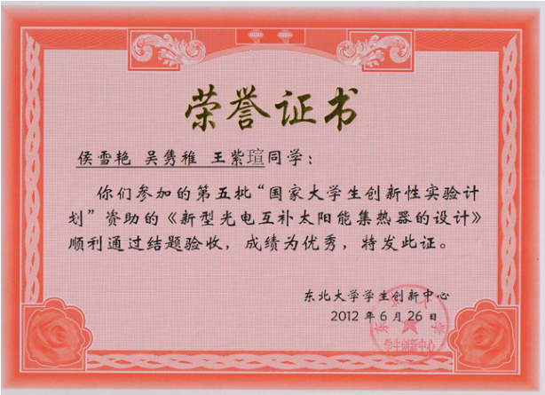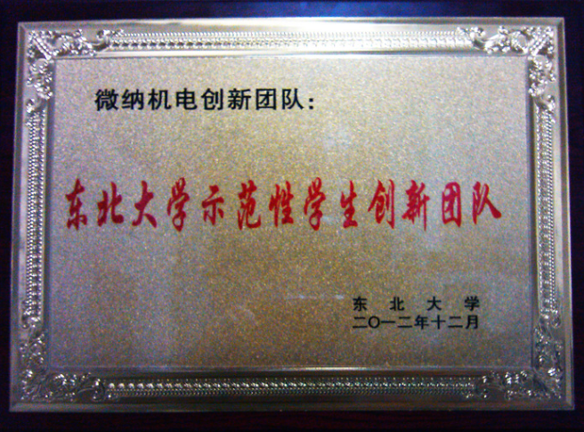 2012年12月11日,东北大学在科学馆学术报告厅召开2012年度学生科技创新工作颁奖典礼,颁奖典礼上,全体师生通过精彩的视频展示,分思维篇、科研篇、挑战篇三个篇章共同回顾和总结了过去一年我校学生科技创新工作所取得的优异成绩,与会嘉宾为获奖的先进集体和个人颁奖。为树立科技创新典型,授予本组“东北大学创新团队称号”,并为“微纳机电”创新团队授牌,全校仅8个团队获此殊荣。为打造学生中的“诺贝尔奖”,全校师生从84名申报者中优中选优,最终评选出15名“东北大学第五届学生科学奖”获得者,本组侯雪艳、吴隽稚均被选中,并由校党委书记孙家学为其颁奖。此外本组李建昌老师还被评为“学生科技创新活动优秀指导教师”,侯雪艳、吴隽稚被评为“大学生创新性实验计划优秀学生”。