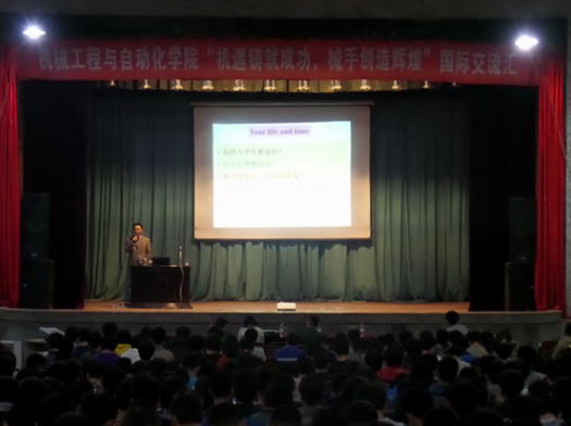 为增强人才培养质量、提升学生国际竞争力,培养学生国际化视野,机械工程与自动化学院于4月10日18:30在基础学院会堂举行了一次“机遇铸就成功,械手创造辉煌”国际交流汇活动。本次活动邀请李建昌老师和他精心培养的两名优秀研究生曹青、吴隽稚,与我院全体2013级学生进行交流,辅导员郑鑫老师出席本次交流活动。