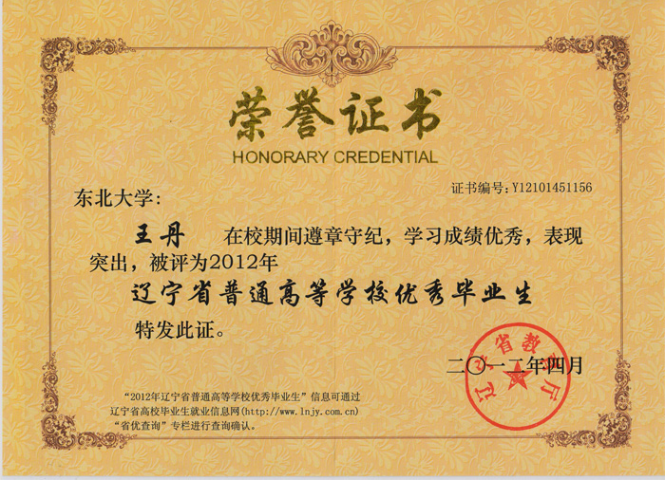 WangDan awarded the honorary of Liaoning outstanding graduates