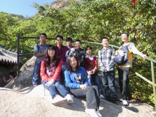 2012年国庆,真空薄膜器件研究组成员在导师个人部分赞助(壹千元)下,赴丹东凤凰山旅游。研究组成员徒步前往丹东抗美援朝纪念馆,看到了当时作战的大炮、飞机和运输的火车。参观了陈列馆、空军专馆、全景画馆和露天兵器陈列场。全面地了解伟大的抗美援朝战争和抗美援朝运动;而全景画馆陈列有全景画《清川江畔围歼战》,画面以抗美援朝战争第二次战役为背景,以清川江畔三所里,龙源里、松骨峰等阻击战为重点,形象地反映志愿军在战场上的英雄气概。感受到了美好生活的来之不易,更应该珍惜现在时光努力学习。研究组成员次日前往凤凰山,它以秀美的自然山岳风光称绝,以独特的宗教人文景观为特色,集“雄”、“险”、“幽”、“奇”、“秀”于一身。先后游览了佛池、紫阳观、解放纪念塔、药王庙、凤凰洞、将军峰和兔儿峰等景点。从这次旅游中,同学们领略了祖国大好河山,增进了同学之间的友谊,开拓了视野,为接下来的科研工作起到了促进作用。
