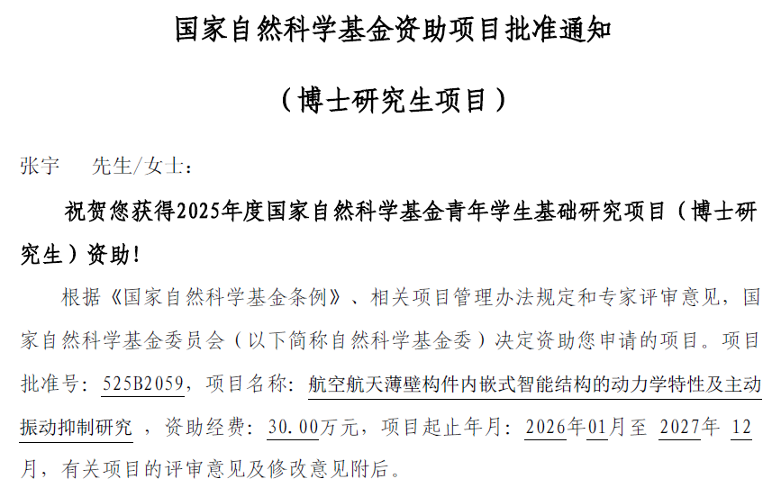 喜报:张宇获批博士生自然科学基金资助 东北大学机械学科首次
