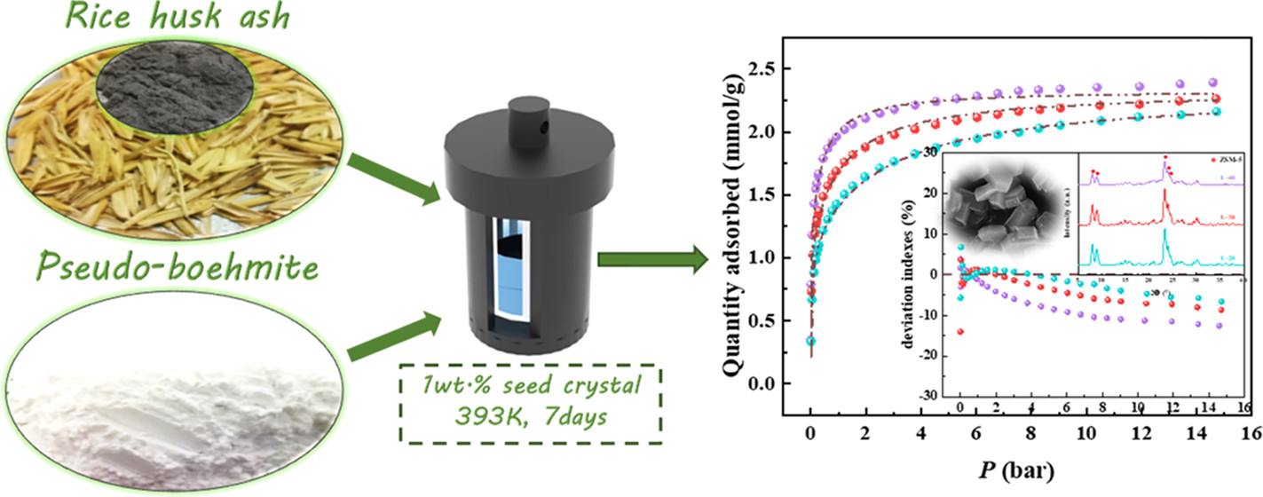 摘要:In this paper, a green synthesis method for ZSM-5 zeolite is explored to reduce the synthesis cost, environmental hazard, and reaction temperatures. For the ZSM-5 samples prepared at low temperatures, the influence of factors such as the hydrothermal temperature, crystallization time, and the number of seeds is systematically investigated. The adsorption isotherm of CO2 is used for fitting analysis of adsorption models and determination of the adsorption selectivity. The results show that the best one among the three samples presents the highest CO2 adsorption capacity of 2.39 mmol/g at 273 K and 15 bar. It is prepared with a hydrothermal temperature of 393 K, crystallization time of 7 days, and a seed crystal of 1 wt %. The dual-site Langmuir model can well describe the experimental data, indicating that double adsorption sites rather than the simple single-layer adsorption are dominant in samples. As the pressure increases, the adsorption capacity calculated by the model is much lower than the actual value with a deviation index of 12.5%. At a pressure of 1 bar, the optimal selectivity is attained with sample L-20, viz., CO2/N2 of 34.3 and CO2/O2 of 70.2. The green synthesis method reported in this research can be used to successfully prepare ZSM-5 zeolite, and it shows excellent CO2 adsorption performance. In addition, the use of low-cost raw materials and template-free synthesis methods will facilitate the large-scale application of green synthesis processes in the future.