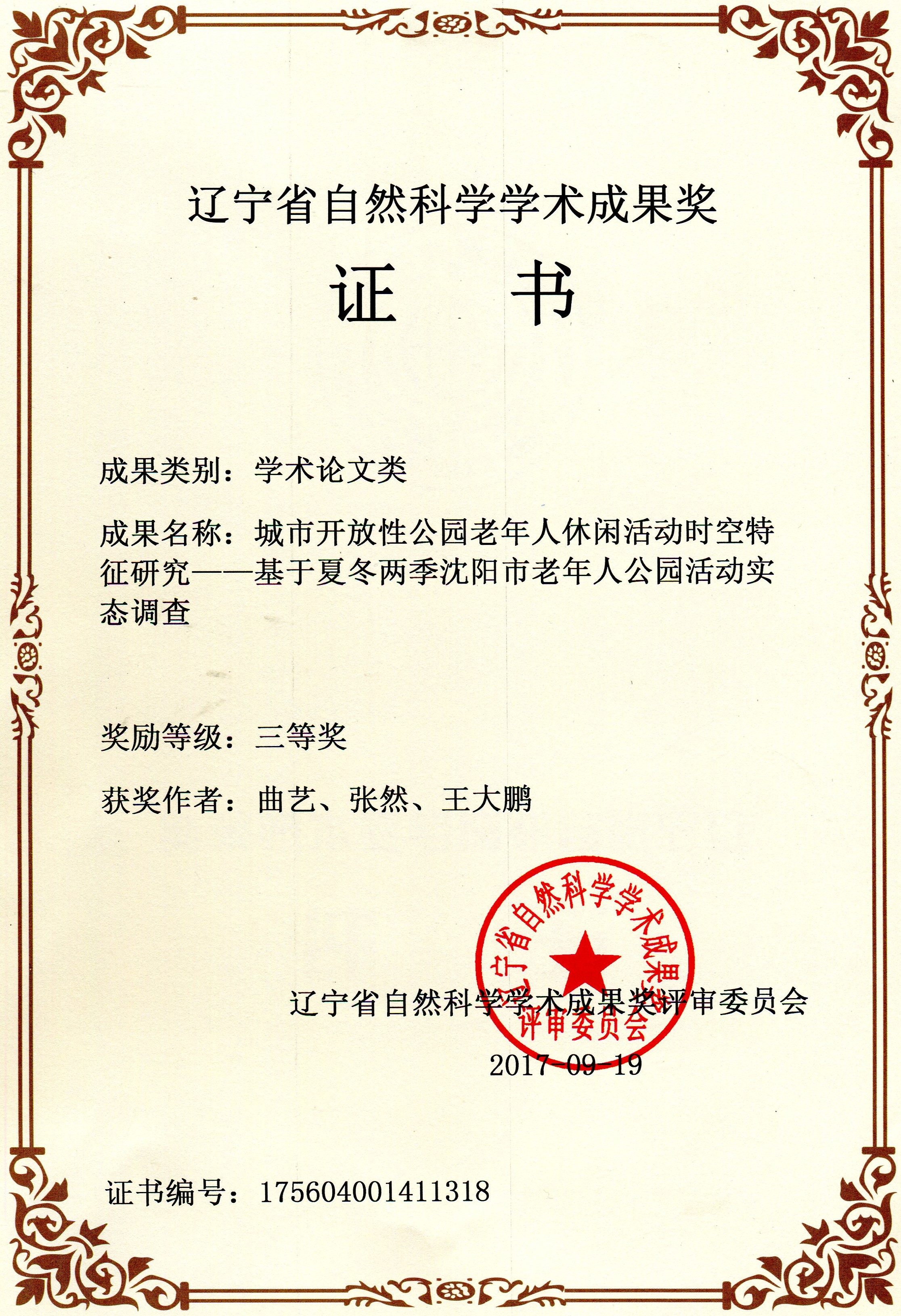 辽宁省自然科学学术成果奖三等奖